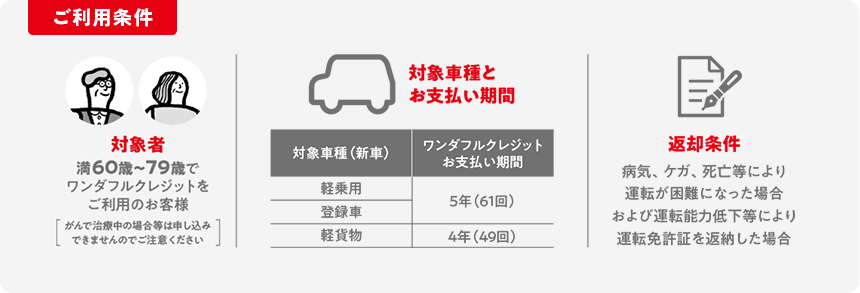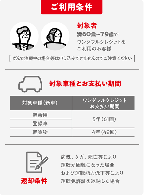• 満60歳~79歳で、軽乗用・登録車はワンダフルクレジット5年を、軽貨物はワンダフルクレジット4年をご利用いただいたお客様がご加入いただけます。